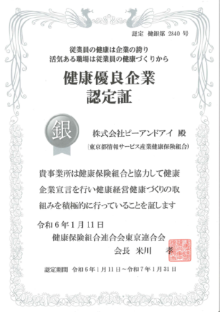 株式会社ピーアンドアイは、健康保険組合連合会東京連合会へ「健康企業宣言」を行い、健康経営・健康づくりの取組みを積極的に行っている企業として、令和6年1月11日付けで健康優良企業認定証「銀の認定」を取得いたしました。